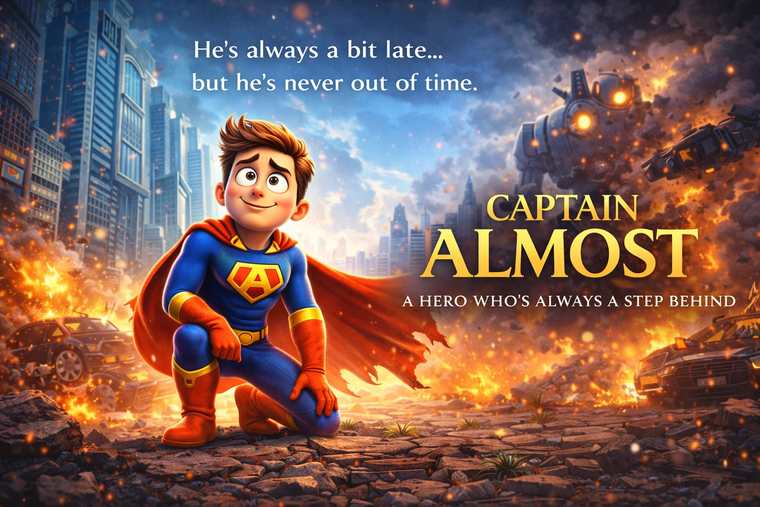 Captain Almost flips the superhero myth with a protagonist who misses every cue yet never stops trying. His late entrances, broken set pieces, and accidental victories build a story about intention over timing. The short blends iconic hero framing with tight comedic beats to deliver a charming, crowd-pleasing ride.