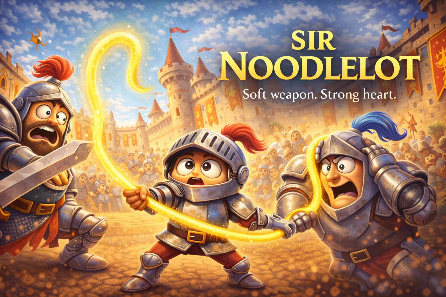 Sir Noodlelot is a medieval parody where bravery takes unexpected forms. Armed with nothing but a noodle, this reluctant knight stumbles through danger, winning by accident, improvisation, and luck. The result is a bright, family-friendly adventure with bold silhouettes and a heroic heart hidden beneath the jokes.